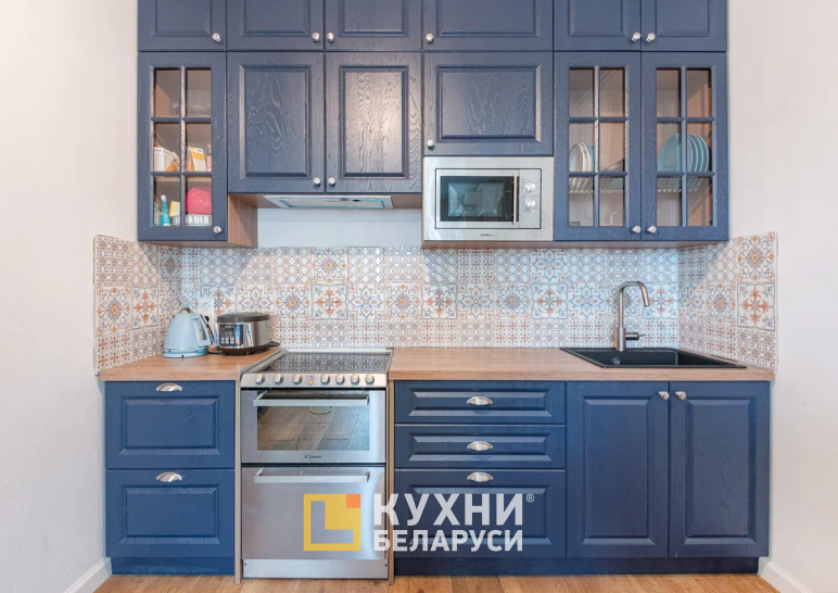 Прямой гарнитур «ПИ375» подойдет как для маленьких, так и средних размеров кухонь. Он сочетает стиль кантри и классику. Глубокий синий цвет фасада дополняется темными древесными оттенками. Столешница сделана под дуб, внутреннее пространство шкафов — под вяз. Такая цветовая палитра способна создать домашний уют и теплую атмосферу.
