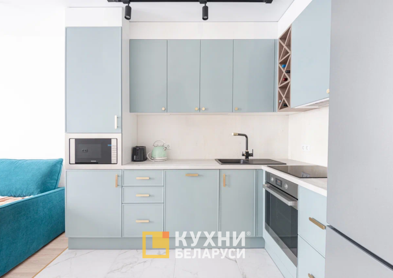 Мебель выдержана в стиле прованс с нотками модерна. Серо-голубой пастельный оттенок фасада создает приятную домашнюю атмосферу, не нагружает пространство, визуально делает его больше. Белая столешница и стеновая панель, а также вставка под дерево среди верхних шкафов завершают эту цветовую композицию.