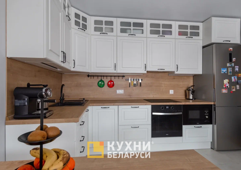 Угловой гарнитур «ПС744» выполнен в скандинавском стиле с элементами классики. Дизайн — спокойный и уютный. Белый цвет мебели гармонично сочетается с древесным оттенком стеновой панели. Столешница под дерево выступает как бы ее продолжением. В проекте нет лишних деталей и украшений. Рамочные фасады со строгими прямыми линиями придают особую утонченность. Верхние шкафчики-витрины оснащены матовым стеклом. Такой элемент делает конструкцию легче и изящнее. Дополняют общую композицию черные ручки-рейлинги.