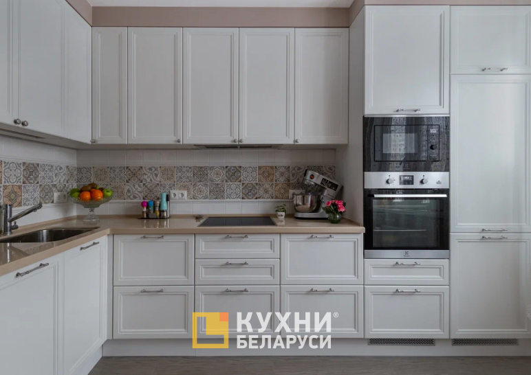 Угловой гарнитур «ПЖ653» в классическом стиле придется по душе ценителям строгости и лаконичности. Дизайн мебели сдержанный, без лишней вычурности. При этом рамочные фасады и фигурные ручки-кнопки и ручки-рейлинги подчеркивают черты классики. Симметрично расположенные шкафчики и ящики добавляют проекту изюминку и делают композицию завершенной.