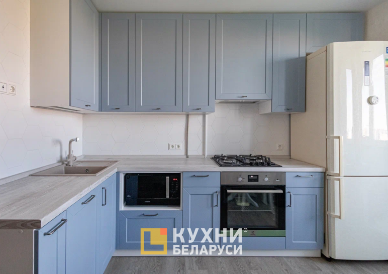 У гарнитура трехцветная палитра. Корпус выполнен в белом цвете, дверцы в оттенке «Серенити», столешница — под светлое дерево. Такая комбинация придает помещению уюта и тепла, делает атмосферу поистине домашней и комфортной. Завершают композицию рамочные фасады и черные ручки-скобы.