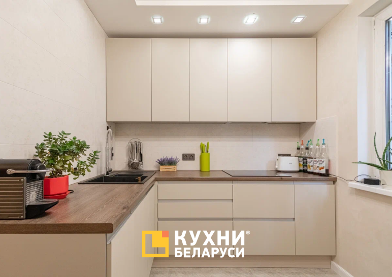 У комплекта угловая конфигурация. При этом навесные шкафы находятся с одной стороны, что также подчеркивает современный характер гарнитура. Верхний ярус под потолок и глубокие вместительные ящики создают увеличенную систему хранения. Вытяжка спрятана в шкафчике, в котором также можно размещать кухонную утварь. Открытых полок и ниш для размещения техники здесь не предусмотрено. Небольшие бытовые приборы можно установить на широкой столешнице.